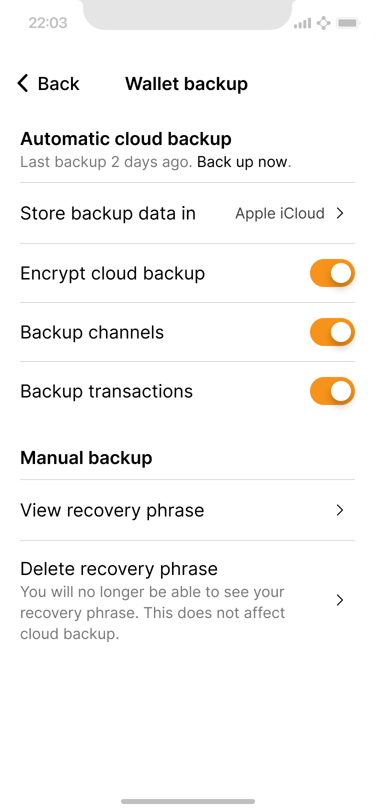 First use also guides users towards appropriate backup options, and users may never need to access this screen. A unique piece of information here is when the last cloud backup was performed. This can give users peace of mind that their information is securely being backed up.